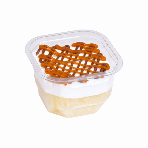 Fluffy sponge cake soaked in milk, covered with rich heavy cream, topped with caramel sauce & milk chocolate sauce.