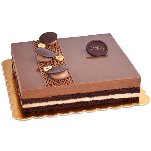 Rich chococlate cake layers, filled with mix of hazelnut praline mousse and chocolate mousse, topped with milk chocolate sauce and hazelnuts.