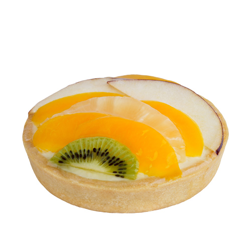 Elegant tart with buttery shell, filled with fresh cream, covered with fresh fruit slices.