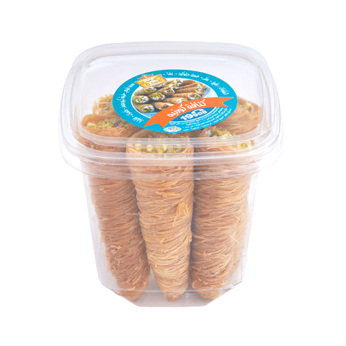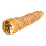 Cunchy Coned Kunafa, filled with fresh cream, decorated with nuts, sweetened with syrup.