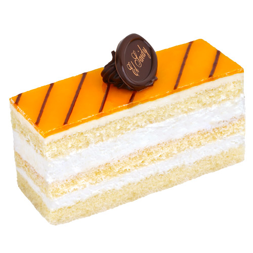 Vanilla cake layers, filled with fresh cream and mango sauce, topped with fresh mango sauce layer.