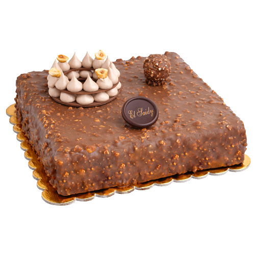 Fudge cake layers, filled with mix of chocolate cream & hazelnut cream, topped with milk chocolate and nuts.