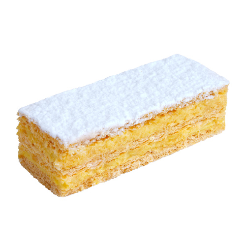 Elegant dessert of puff pastry layers, filled with fresh pastry cream, sugar glazed top.