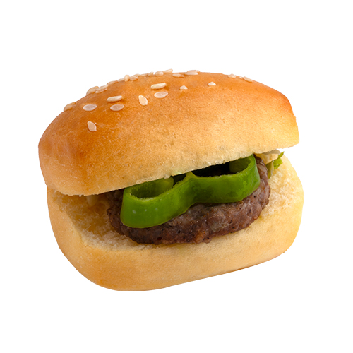 ميني ساندوتش يحتوي على قطعة لحم بلدي طازجة، مضاف إليها الخضراوات الطازجة، ويعلوه حبات السمسم المحمصة.